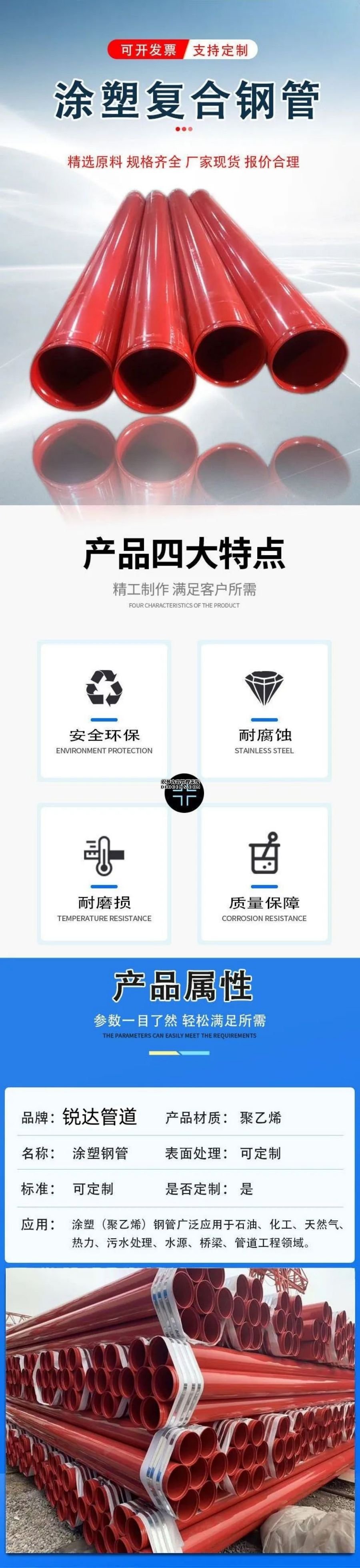 1、涂层附着力:聚乙烯涂塑层附着力≥30N/cm,环氧树脂涂层的附着力为1~3级。